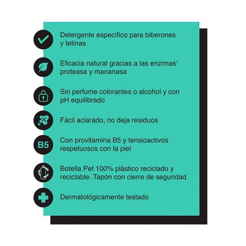 Este detergente especial para biberones y tetinas, limpia de forma profunda los restos de leche, zumo y papilla, así como los restos de comida que puedan quedar en la vajilla infantil. Puede usarse también para el lavado de otros accesorios como extractores de leche, chupetes, mordedores y sonajeros.