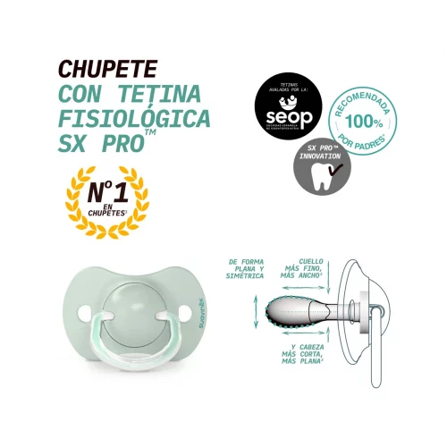 Estos chupetes cuentan con la tetina fisiológica Sx Pro, diseñada para respetar el desarrollo bucodental del bebé. Está pensada para no invadir la cavidad oral y proporcionar al bebé la misma sensación que experimenta en su estado natural / fisiológico cuando no lleva chupete.